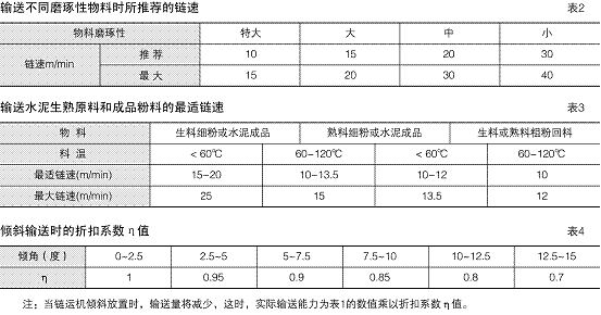 用戶應根據(jù)物料的狀態(tài),先選擇適當?shù)逆溗,鏈速選擇可參見后面表2、表3和各類機型選擇表,表5、表6諸如磨琢性強的物料,溫度高的物料,物料中粗大顆粒比較多的,及料粒大的物料宜選用慢速。對于水泥和生料最適鏈速可參照表3來選擇,其它與水泥性能和狀態(tài)相近的物料也可參照此表選擇。