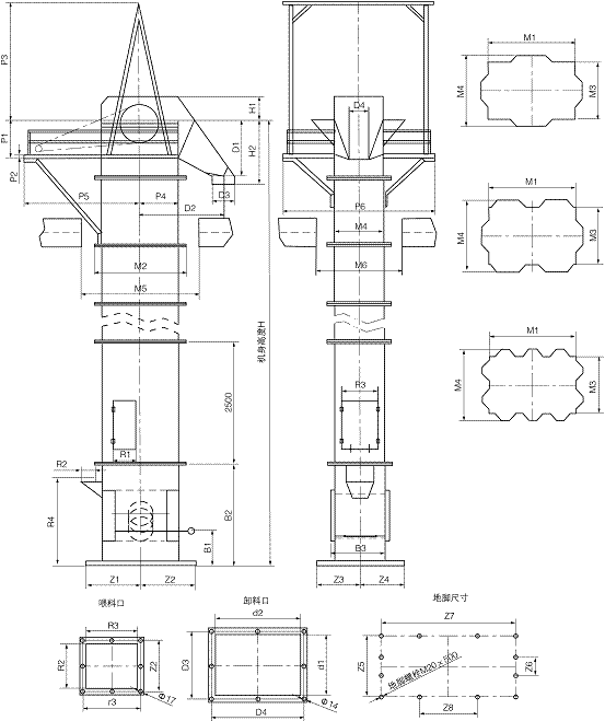 1、上部裝置:安裝有軌道(雙排道)、防止鏈條擺動,逆止器,防止料斗回轉(zhuǎn),物料阻滿下部機殼,卸料口裝有橡膠板防止回料。